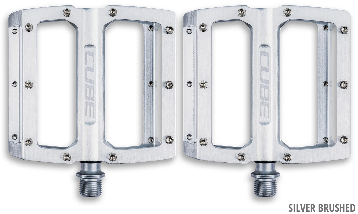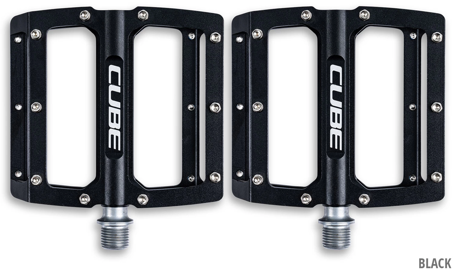 High-Performance-Flat-Pedale von Cube für den progressiven All-Mountain-Fahrer. Leicht und flach dank CNC-Bearbeitung und konkavem Fußbett. Industrie- und Gleitlager sorgen für Leichtgängigkeit auch auf holprigen Trails, die zehn austauschbaren Pins pro Seite für den nötigen Grip.